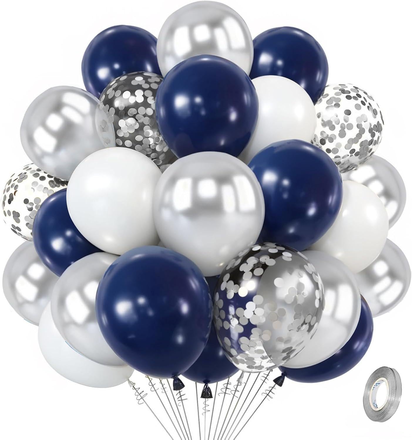 Create a polished, modern look for your celebration with this Navy Blue, White & Silver Balloon Set. With rich royal blue tones, metallic silver shine, and eye-catching confetti balloons, this bundle is perfect for elegant parties, milestone events, and stylish photo backdrops.