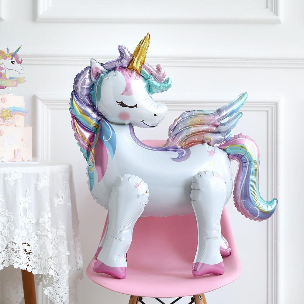 Create magical party moments with this adorable self-standing unicorn balloon set! Featuring large unicorn foil balloons, rainbow foil balloons, star balloons, round balloons, and a pastel Happy Birthday banner — perfect for baby showers, birthdays, and gender reveal celebrations.