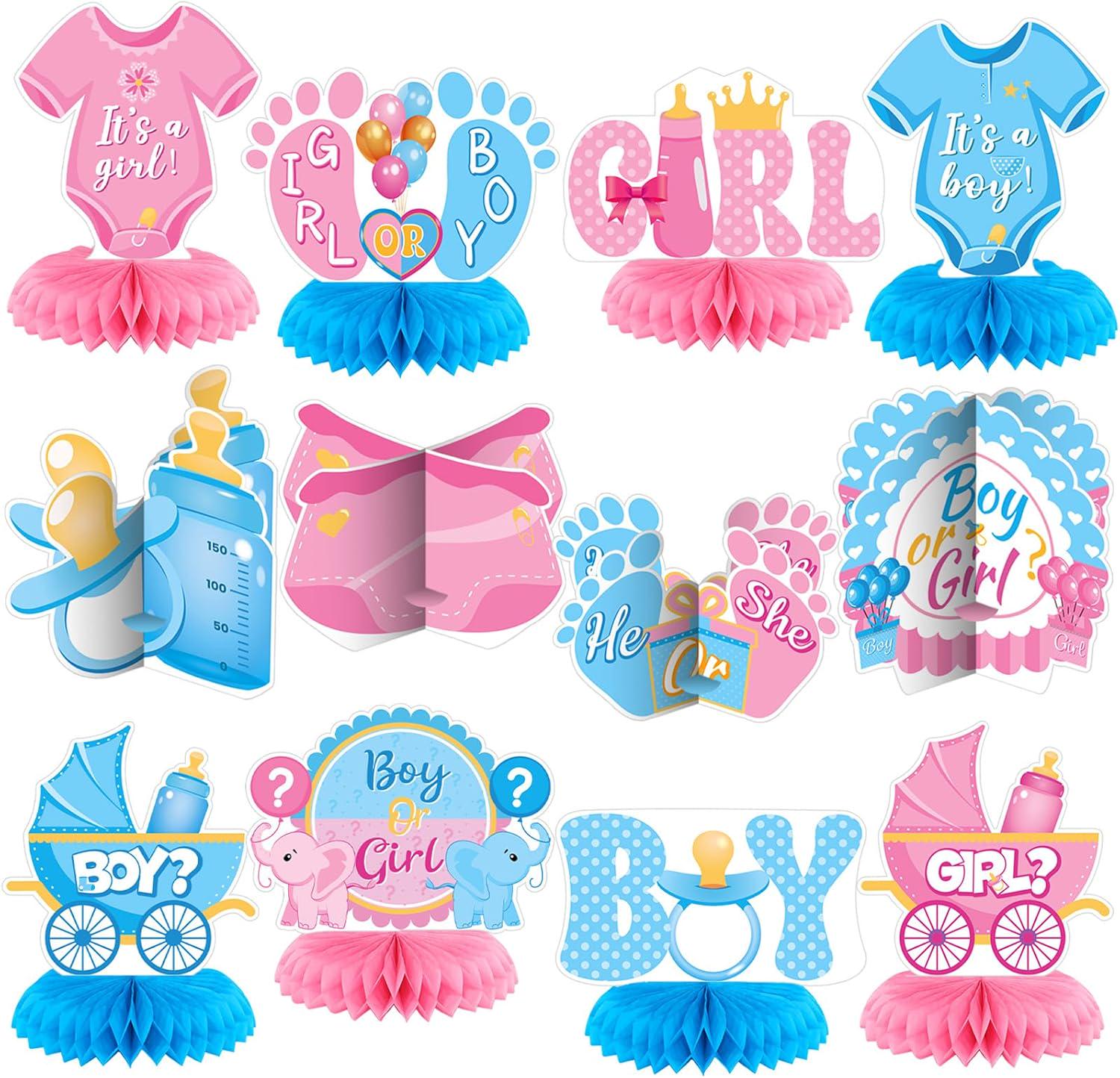 Cute gender reveal centerpiece set for baby showers and party tables.