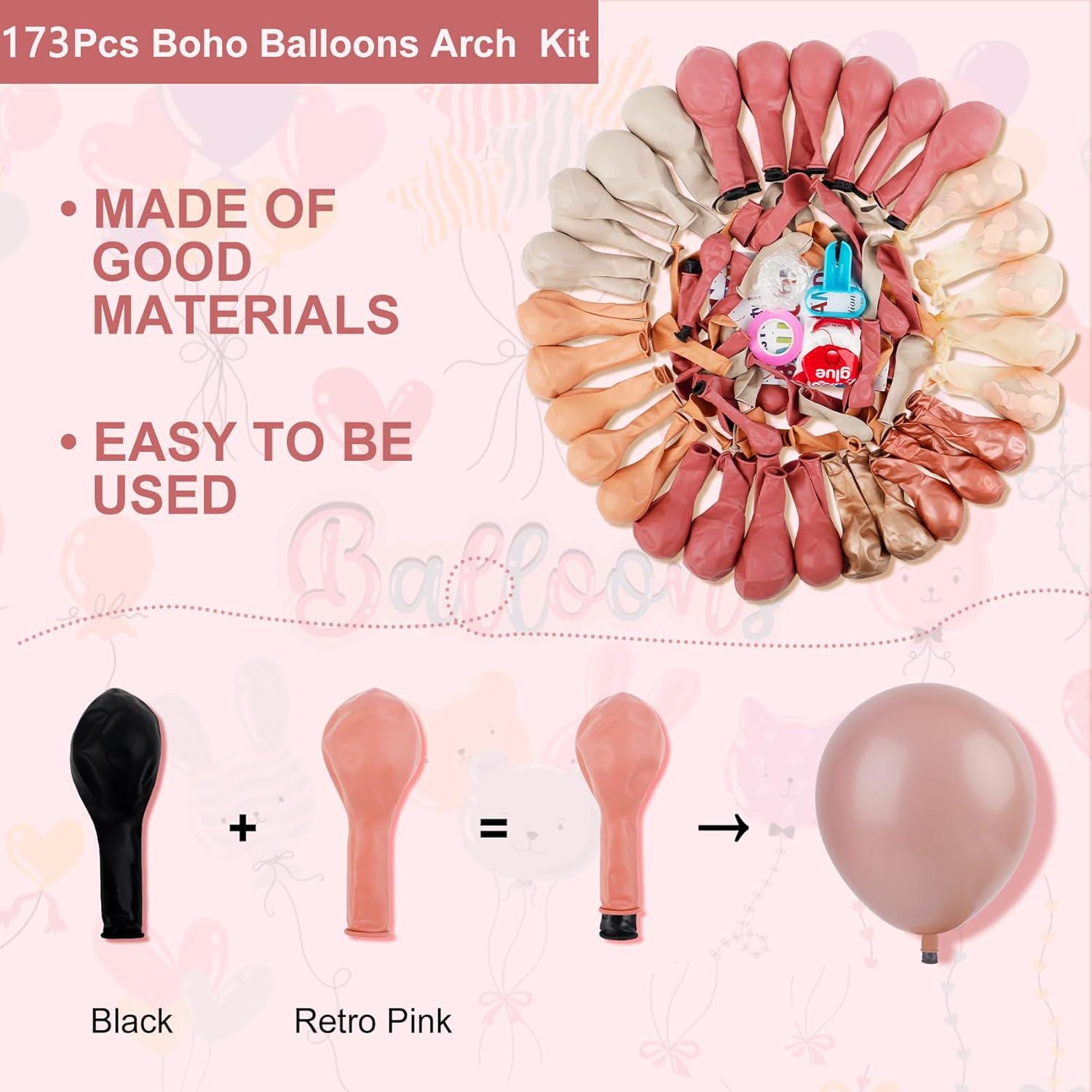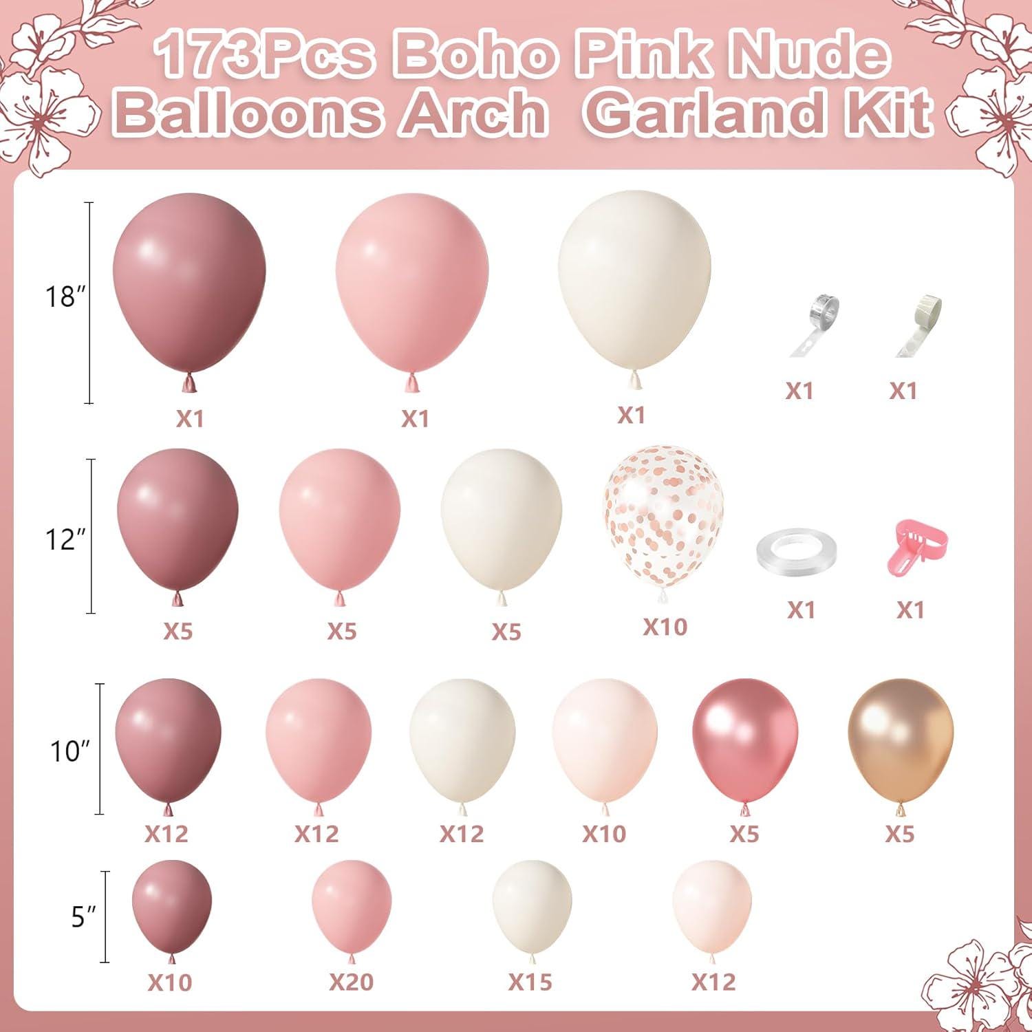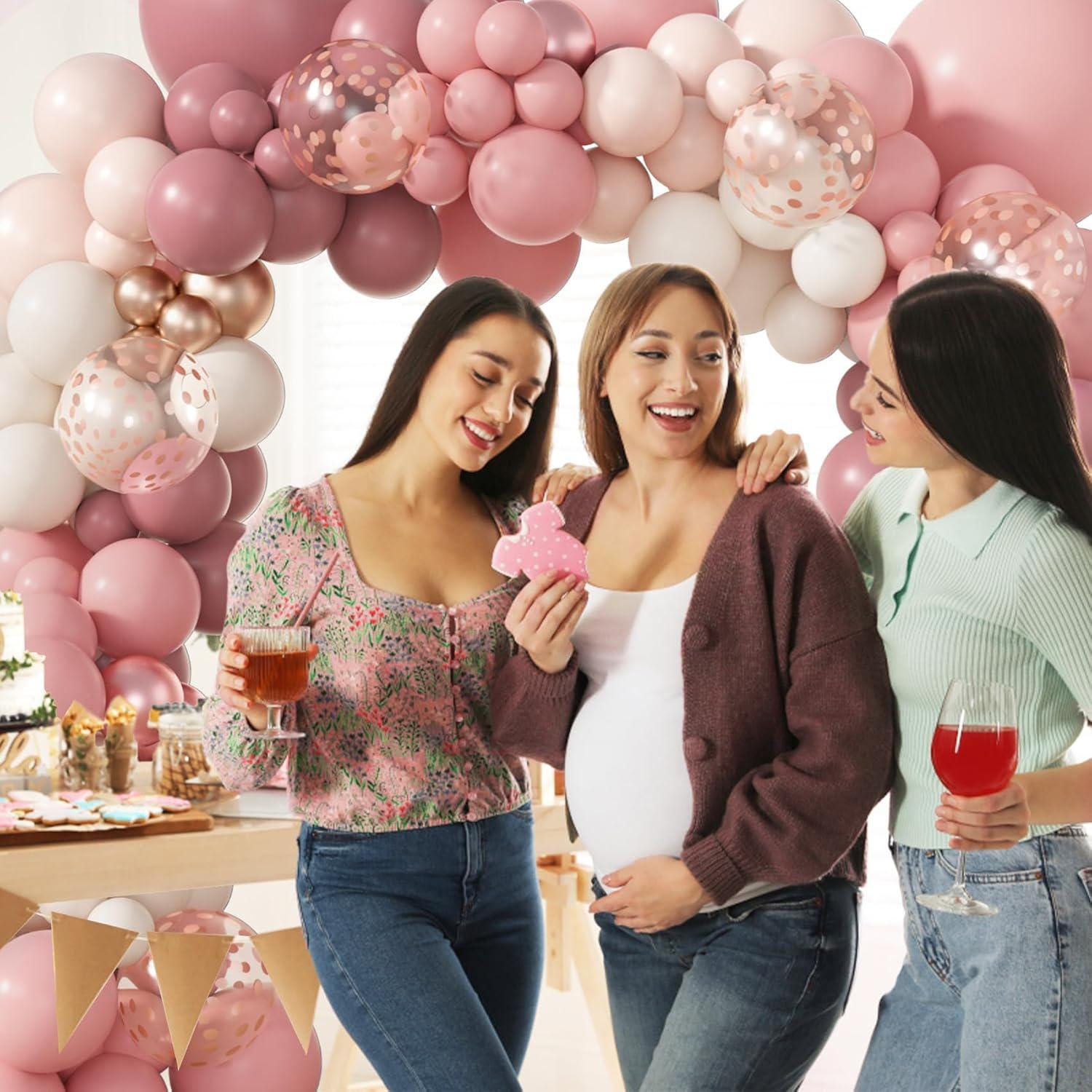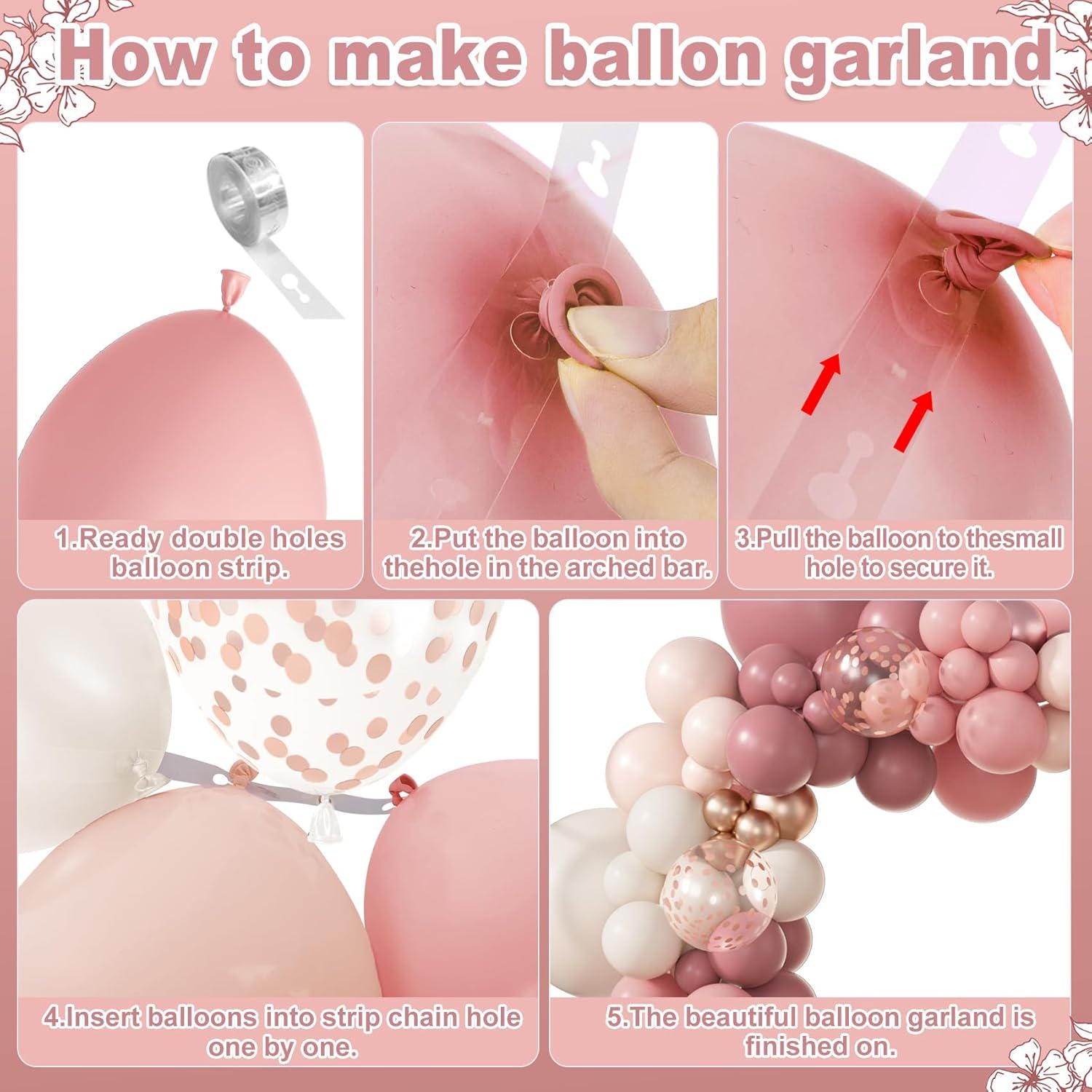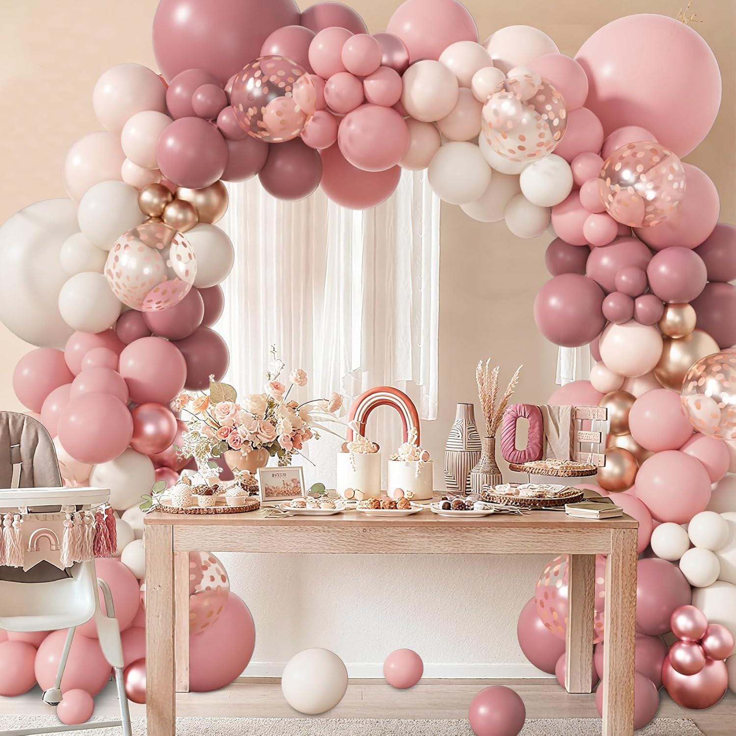 Create a warm and stylish backdrop with this 173-piece dusty pink balloon arch kit, designed for a full, layered look using neutral boho tones like blush, sand, and rose gold.