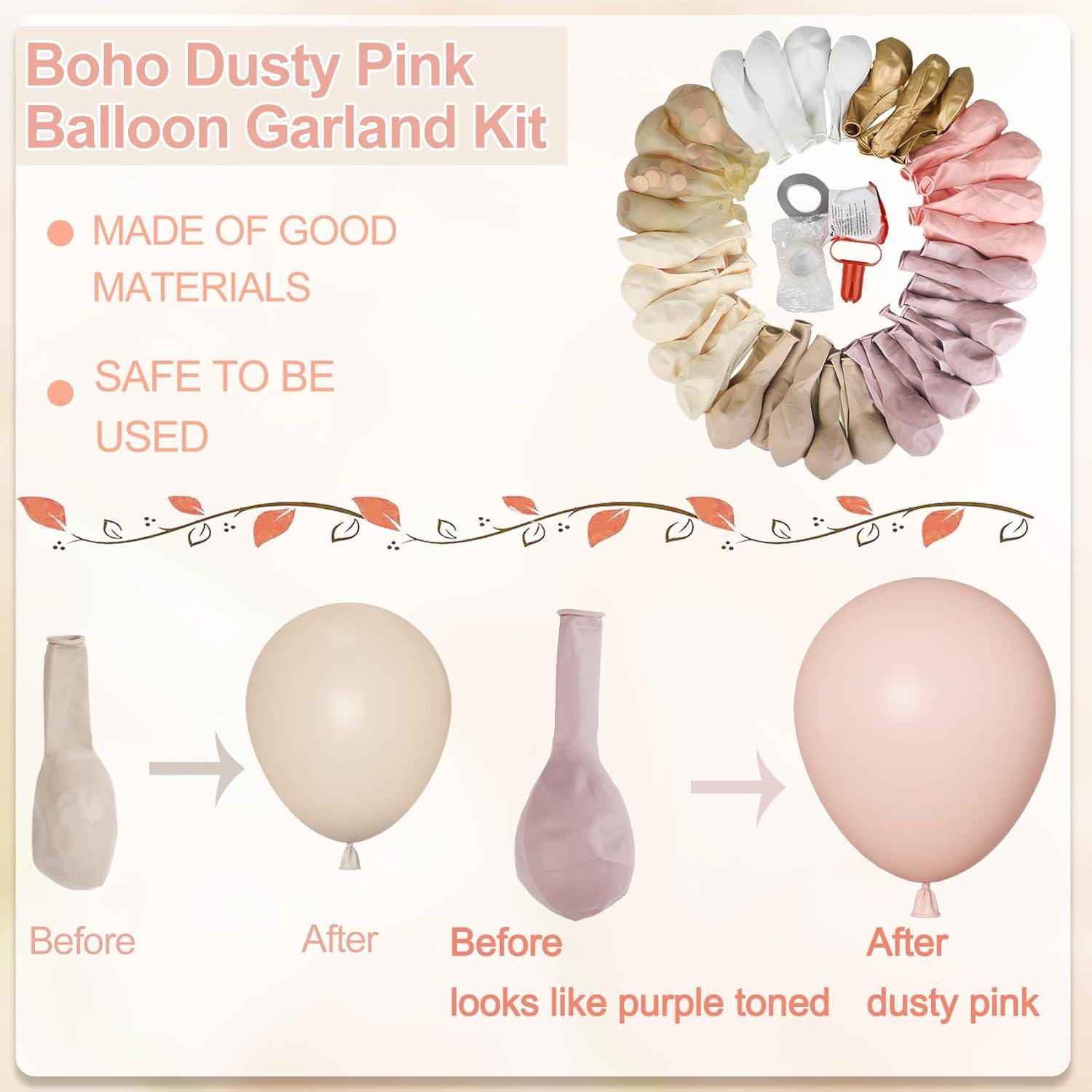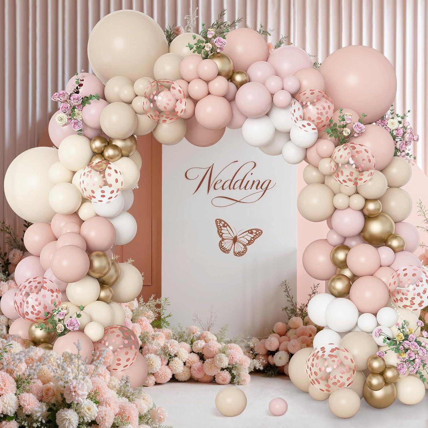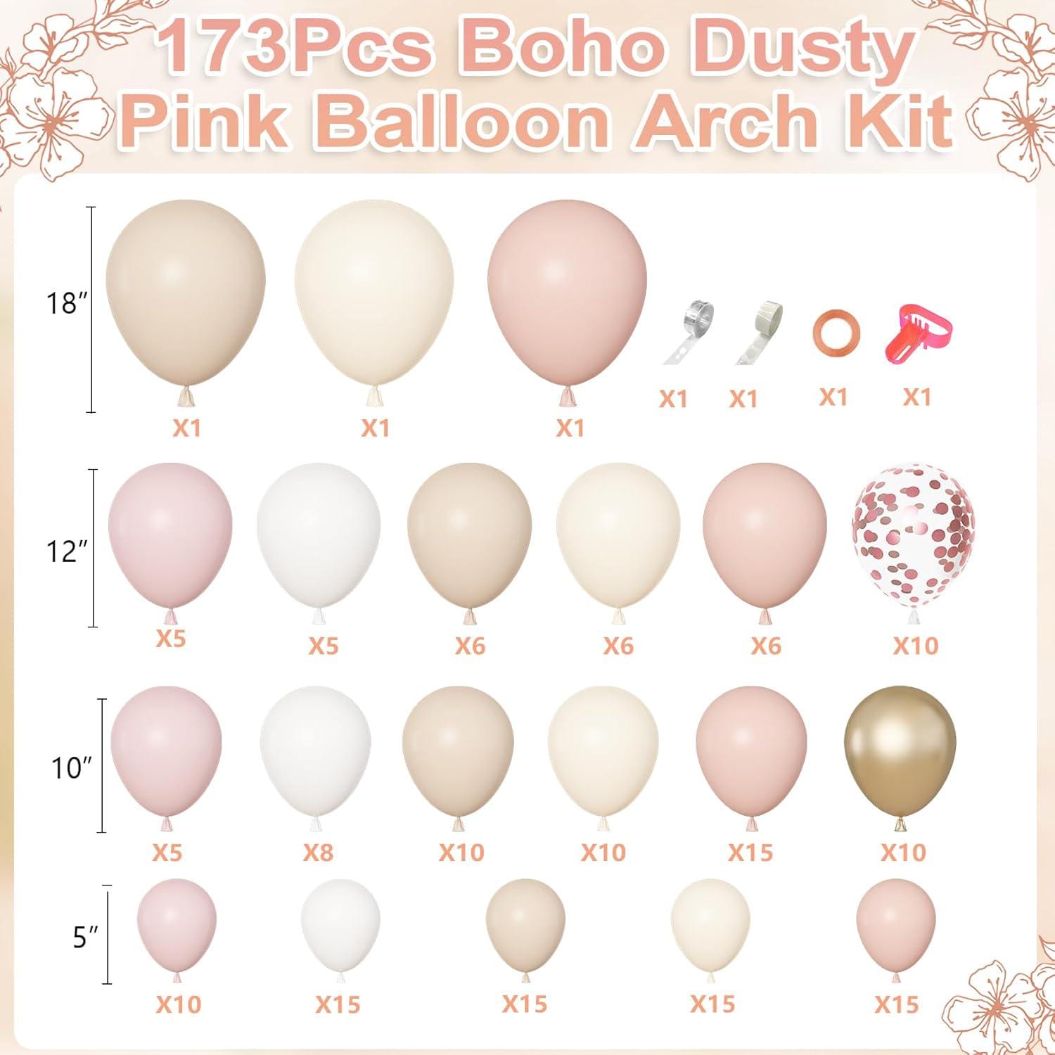 This 173-piece dusty pink balloon arch kit is designed to create a clean, neutral, and elegant backdrop using soft tones like blush pink, ivory, white sand, and metallic gold.