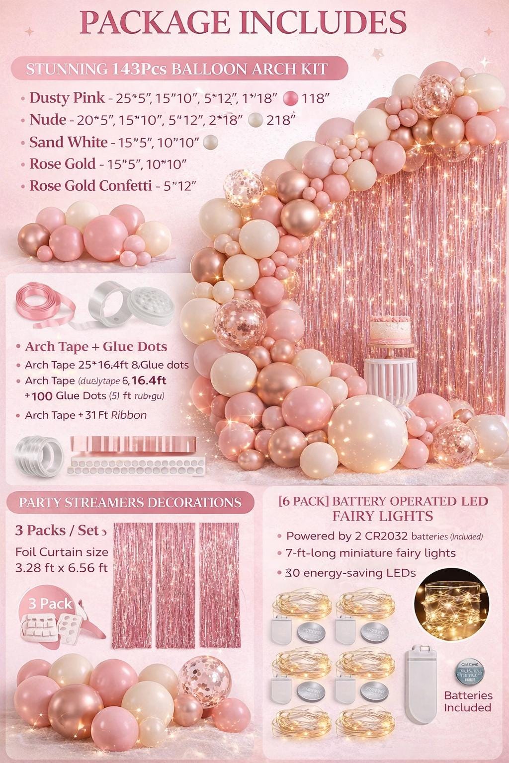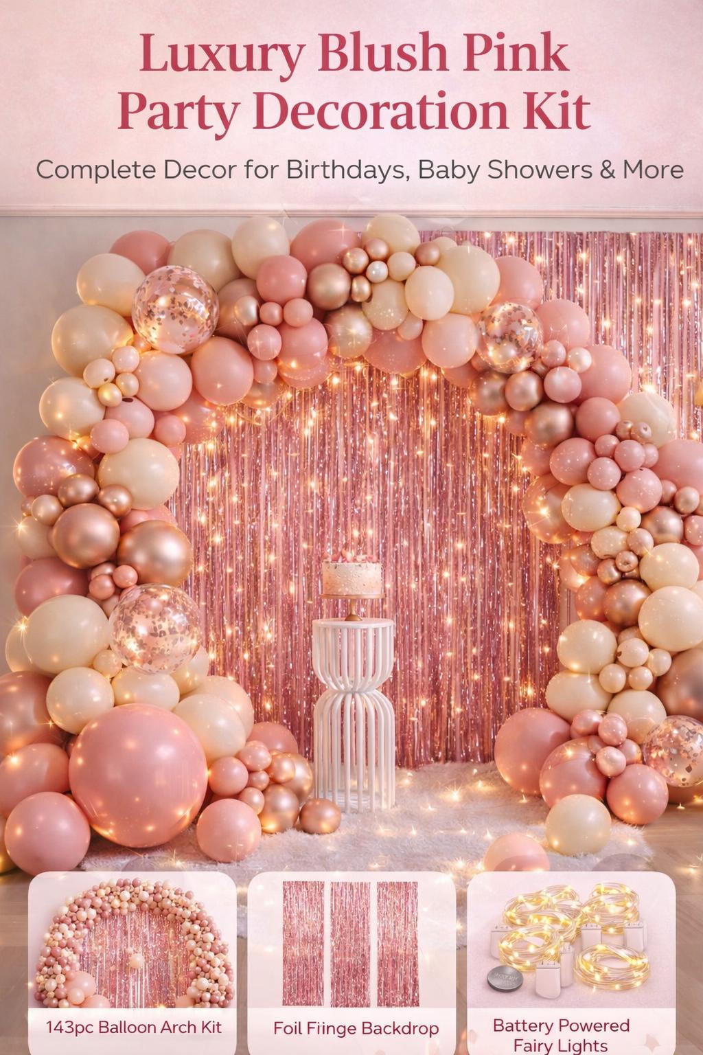 This all-in-one blush pink decoration kit gives you everything needed to create a premium, photo-ready party backdrop at home.